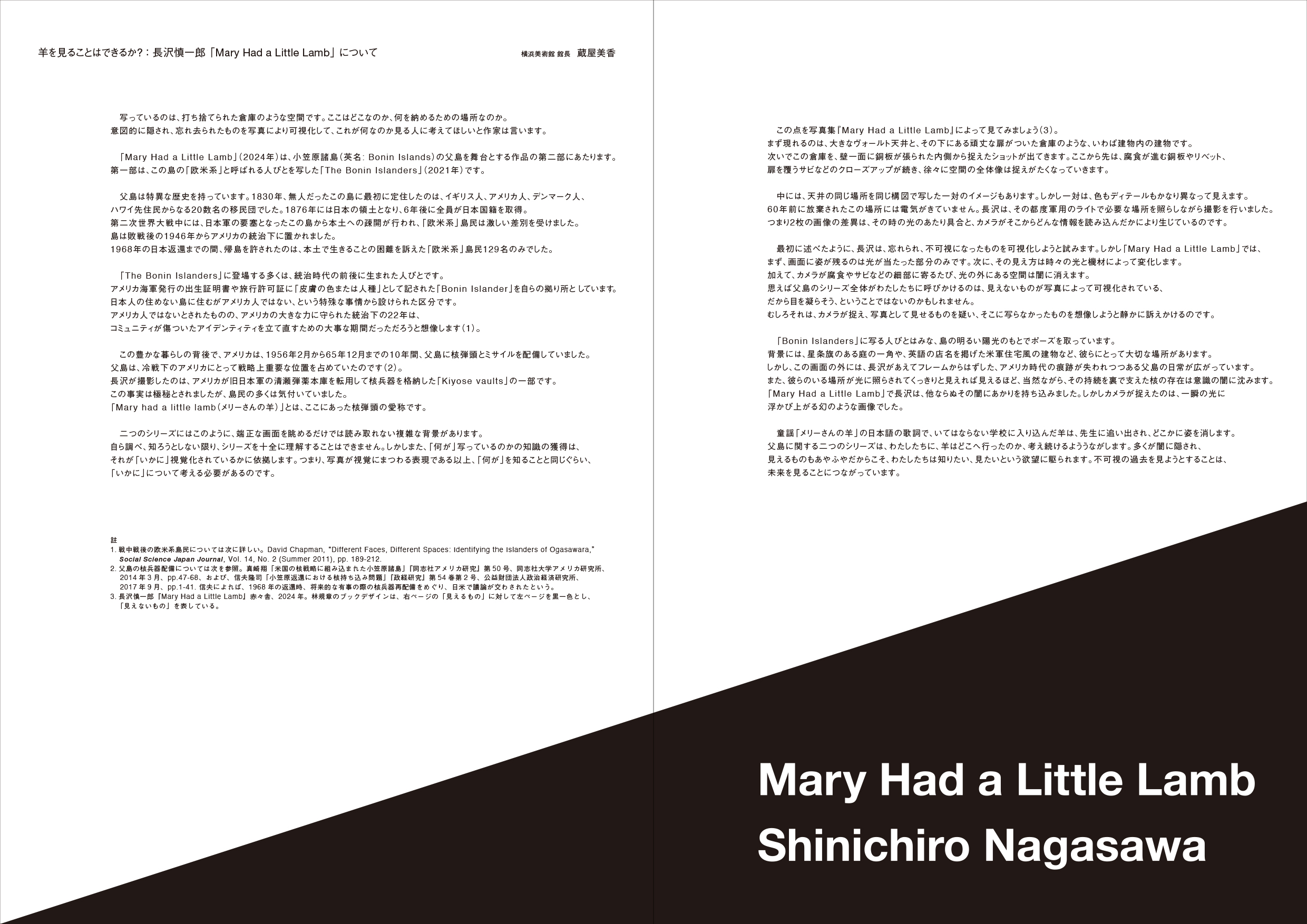 また、本展に際し、テキスト『羊を見ることはできるか? : 長沢慎一郎 「Mary Had a Little Lamb」について』を、横浜美術館 館長の蔵屋美香さんにご寄稿頂きました。会場にてハンドアウトとしてお配りしており、こちらのページでもお読み頂けます。