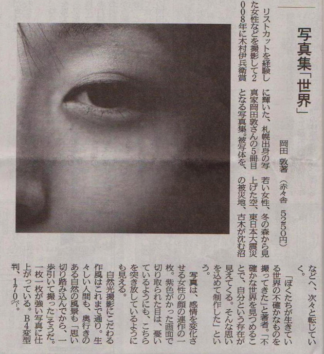 北海道新聞で岡田敦写真集『世界』が紹介されました