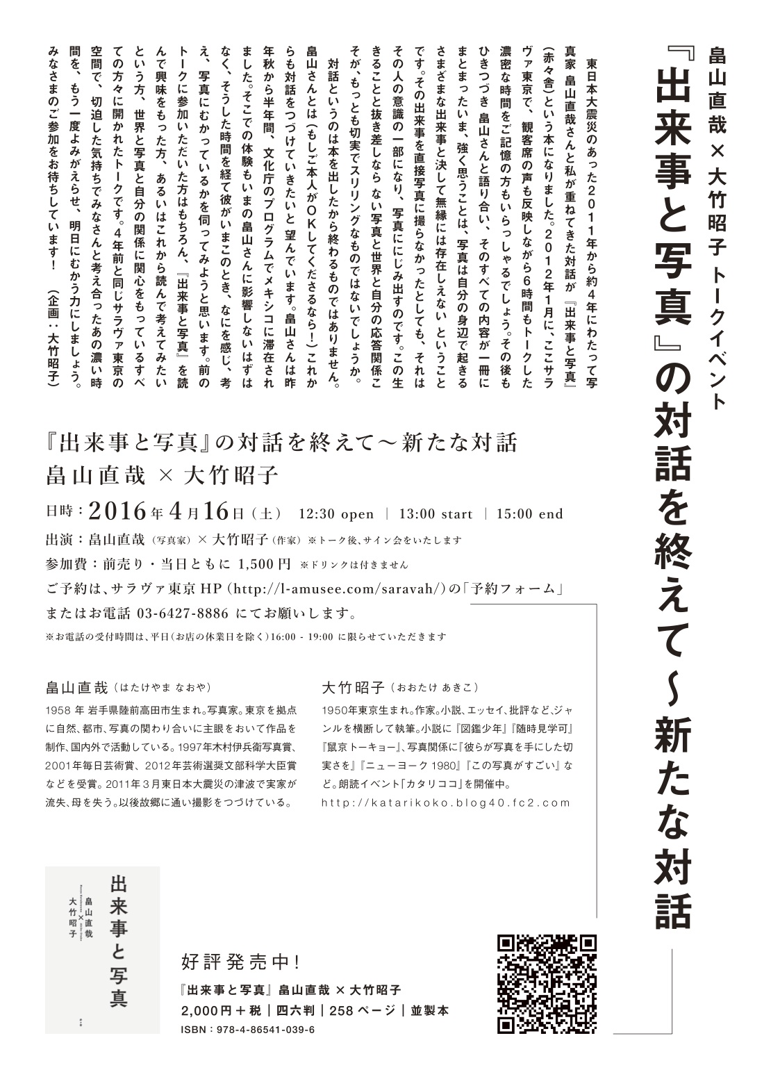 前のトークに参加いただいた方はもちろん、『出来事と写真』を読んで興味をもった方、あるいはこれから読んで考えてみたいという方、世界と写真と自分の関係に関心をもっているすべての方々に開かれたトークです。4年前と同じサラヴァ東京の空間で、切迫した気持ちでみなさんと考え合ったあの濃い時間を、もう 一度よみがえらせ、明日にむかう力にしましょう。みなさまのご参加をお待ちしています!