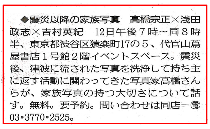 高橋 宗正 × 浅田 政志 × 吉村 英紀トークイベント「震災以降の家族写真」が、いよいよ今週末4月12日(土) 開催されます。