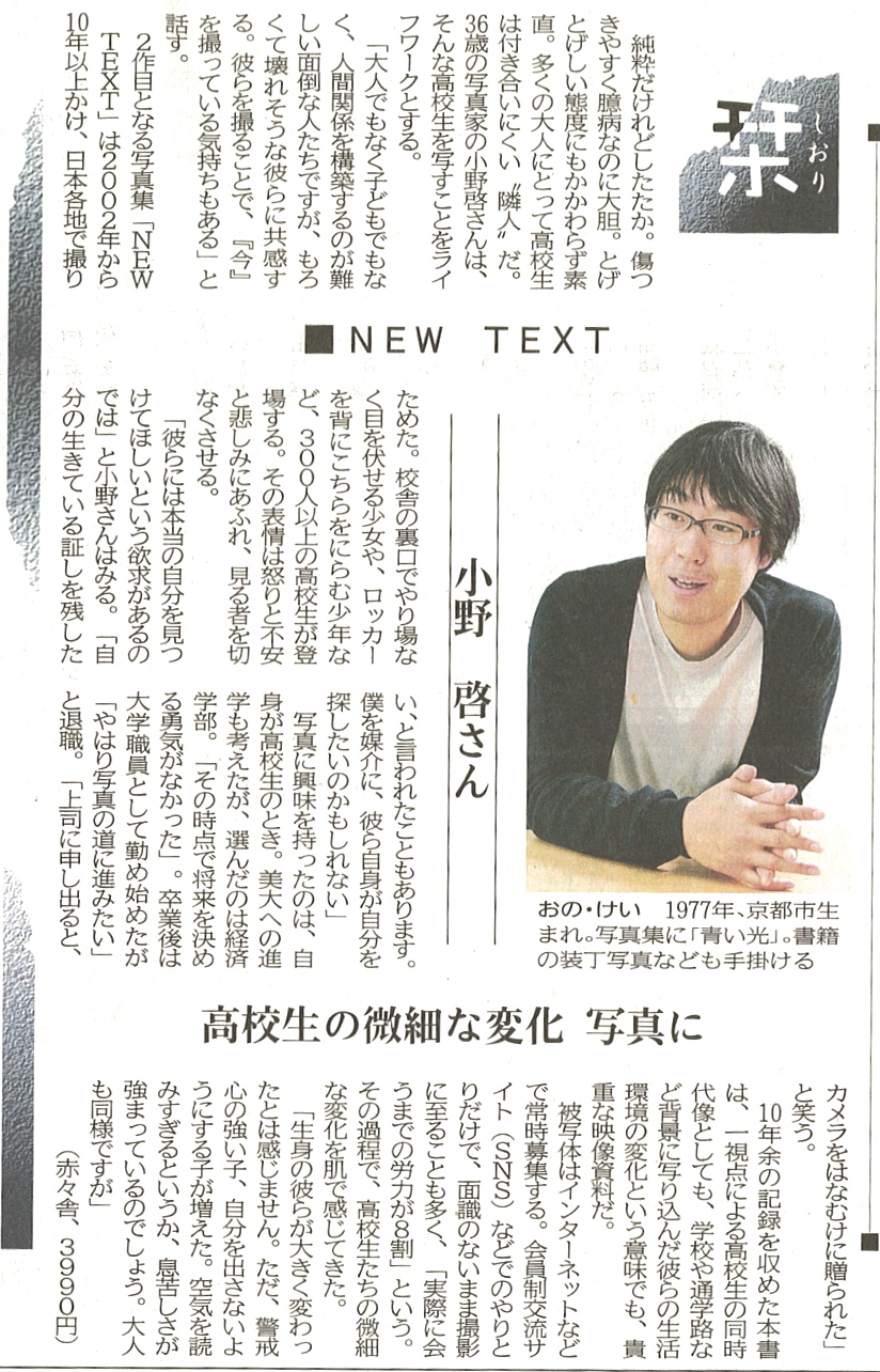 『NEW TEXT』の表紙は、モデルとなってくれた高校生やそのクラスメートによる、無数の「NEW TEXT」という文字の寄せ書きだ。ノートや黒板や路上に書いたその文字を、みなが携帯電話のカメラで撮って小野に送ってくれたという。丹念に敷きつめられた彼らの文字の表紙、そこに浮かび上がってくる、未だ書かれざるテキスト、「NEW TEXT」をひとりでも多くの方に見ていただきたいと願う。