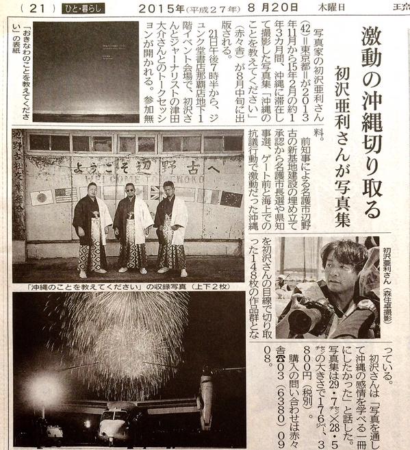 8/23付の東京新聞にて、初沢亜利のインタビューが掲載されました。1年3ヶ月沖縄の移住して感じた沖縄のこと、本土のこと、そして写真、写真集『沖縄のことを教えてください』に関連してお話してます。