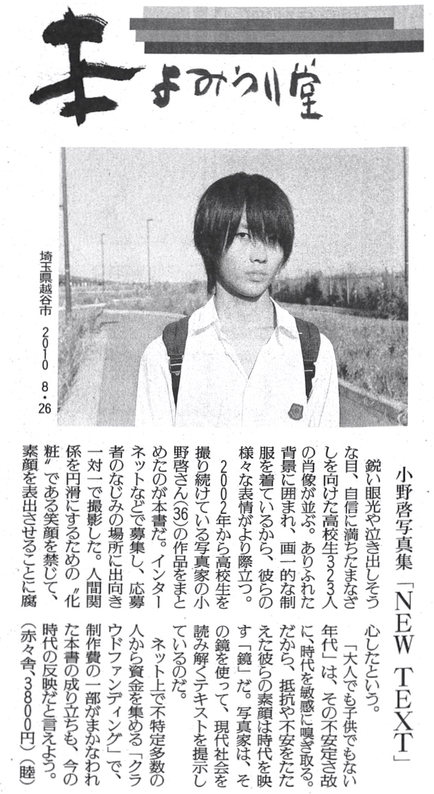 『NEW TEXT』の表紙は、モデルとなってくれた高校生やそのクラスメートによる、無数の「NEW TEXT」という文字の寄せ書きだ。ノートや黒板や路上に書いたその文字を、みなが携帯電話のカメラで撮って小野に送ってくれたという。丹念に敷きつめられた彼らの文字の表紙、そこに浮かび上がってくる、未だ書かれざるテキスト、「NEW TEXT」をひとりでも多くの方に見ていただきたいと願う。
