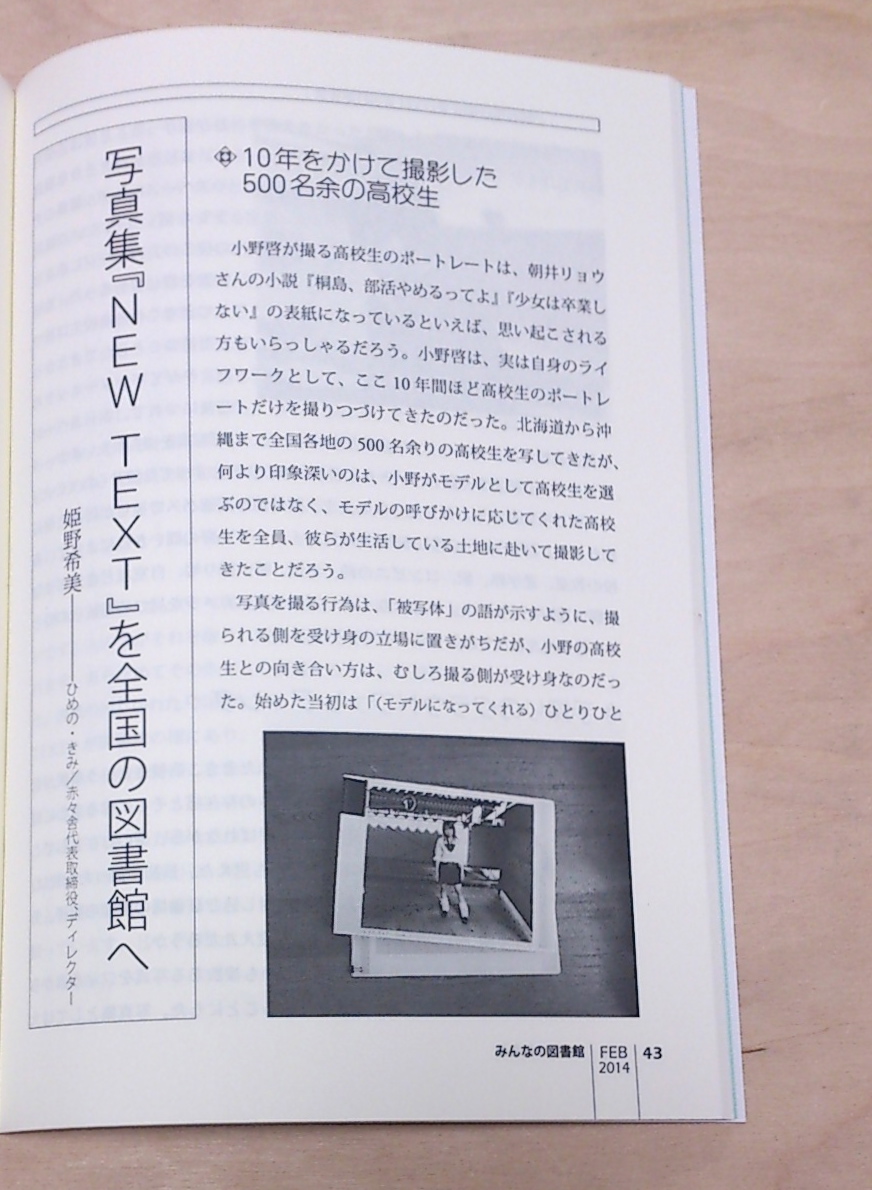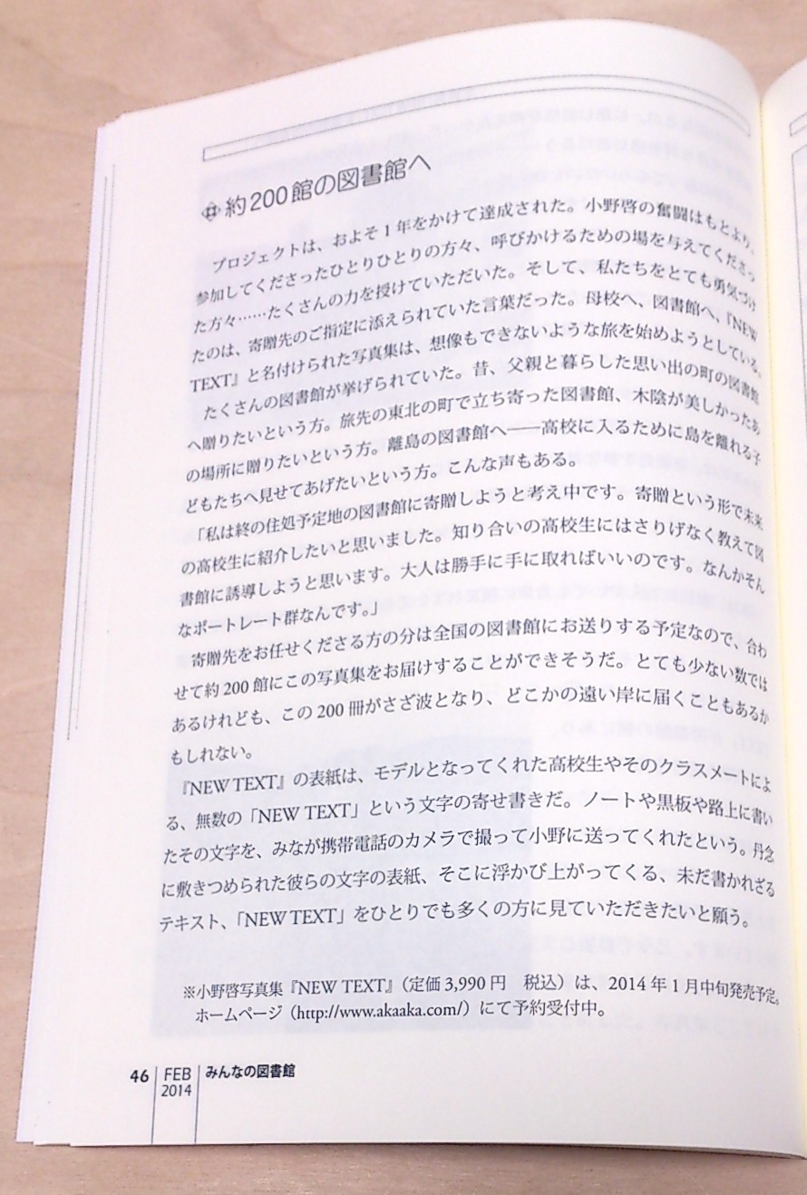プロジェクトは、およそ1年をかけて達成された。小野啓の奮闘はもとより、参加してくださったひとりひとりの方々、呼びかけるための場を与えてくださった方々......たくさんの力を授けていただいた。そして、私たちをとても勇気づけたのは、寄贈先のご指定に添えられていた言葉だった。母校へ、図書館へ、『NEW TEXT』と名付けられた写真集は、想像もできないような旅を始めようとしている。