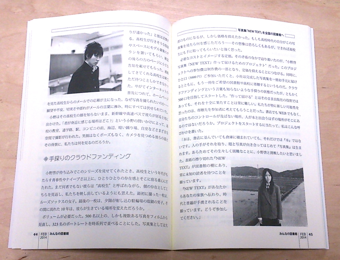 必要なコストとイメージする定価。その矛盾のなかで辿り着いたのが、"小野啓写真集『NEW TEXT』作って届けるためのプロジェクト"だった。このプロジェクトへの参加費は制作費の一部となり、定価を抑えることにつながる。同時に、ひと口(5000円)ご参加いただくと、小社は完成した写真集を一冊お手元に届けるとともに、もう一冊をご希望の図書館や高校に寄贈するというものだ。クラウドファンディングという言葉も知らないような手探りの状態だったが、ともかく500口を目指してスタートした。"作って届ける"とはそのまま出版社の役割ではあっても、それを十全に果たすことは常に難しい。私たちが特に新しい可能性を思ったのは、寄贈先を参加者に考えてもらうことだった。書店でもWEBでもなく、自分たちのコントロールが及ばない場所、人が本と出会うはずの場所がそこにあるのではないだろうか。プロジェクトをスタートするに当たって、私はこんな呼びかけを書いた。